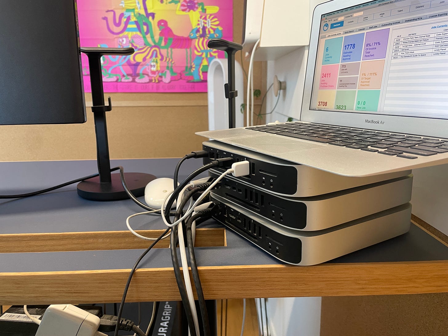 We deployed this new version of JWOS in 2017, right after we established our US office. With a new fibre connection in our Australian office it meant that accessing the app externally was a lot more usable and we were able to migrate away from our external host. As our US office grew however, things got a bit weird. Basically for each staff member who wanted to access the app, they had to have a physical computer in our Australian office that they could connect to. It started with a small HP Mini PC in our server rack, then in 2018 we added a Mac mini on a spare desk. That became three Mac minis in 2019. Then that became three Mac minis with an MacBook Air sitting on top of it in 2020 when we were preparing to open our UK office.