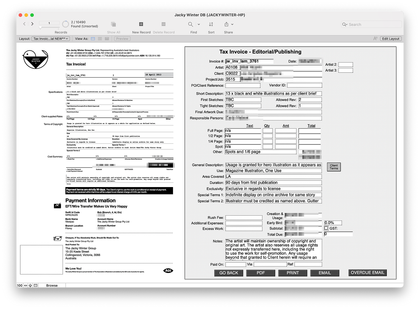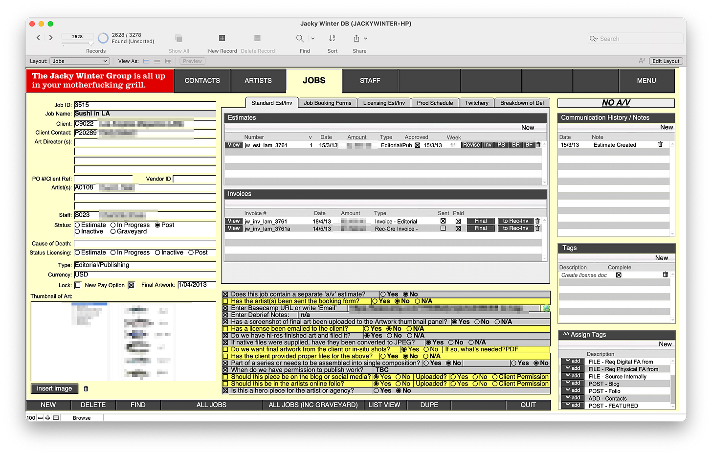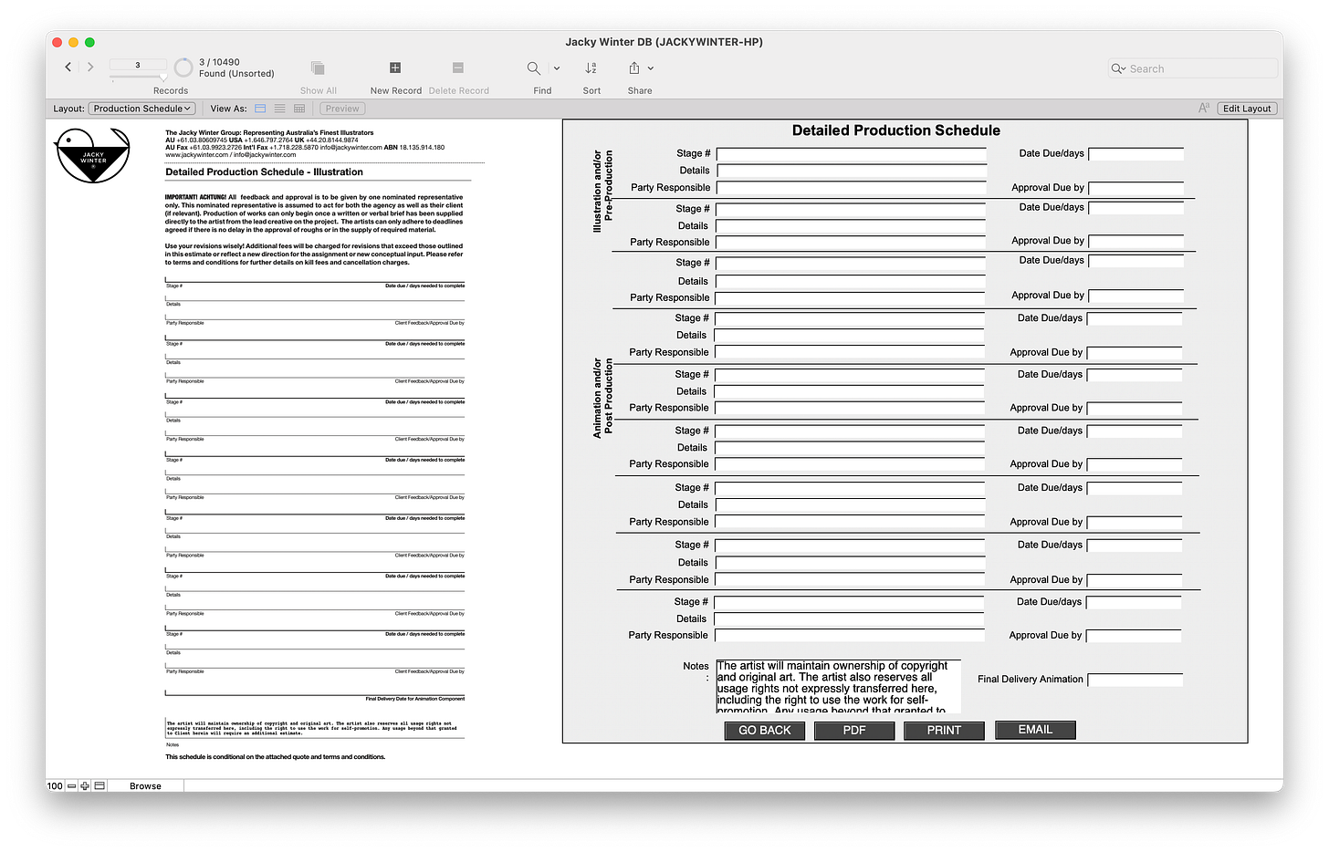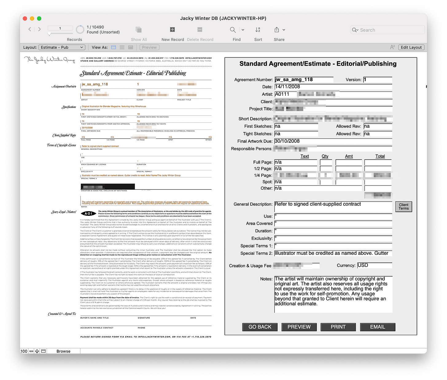 Anyway, after a meeting with Byron, I finally had my own ‘FileMaker Guy’, and in a few months he mocked up our very own app. At first it was very simple - We took the base layers of those indesign files and made them into PDFs that made the background. Then when we entered data into FileMaker, it would ‘print’ it on top of the PDF base and make a new PDF which we could email off to our clients. We could even use my precious fonts! In addition we were able to have a central record of all our jobs, could make revisions of the estimates, start building a database of clients and artists, do reports, a whole bunch of stuff.