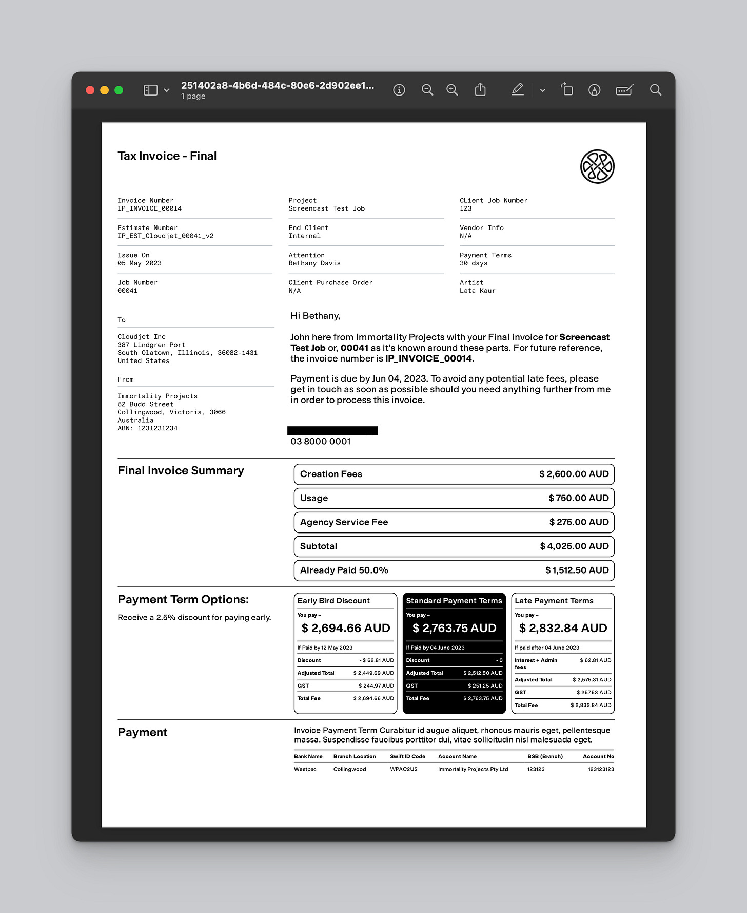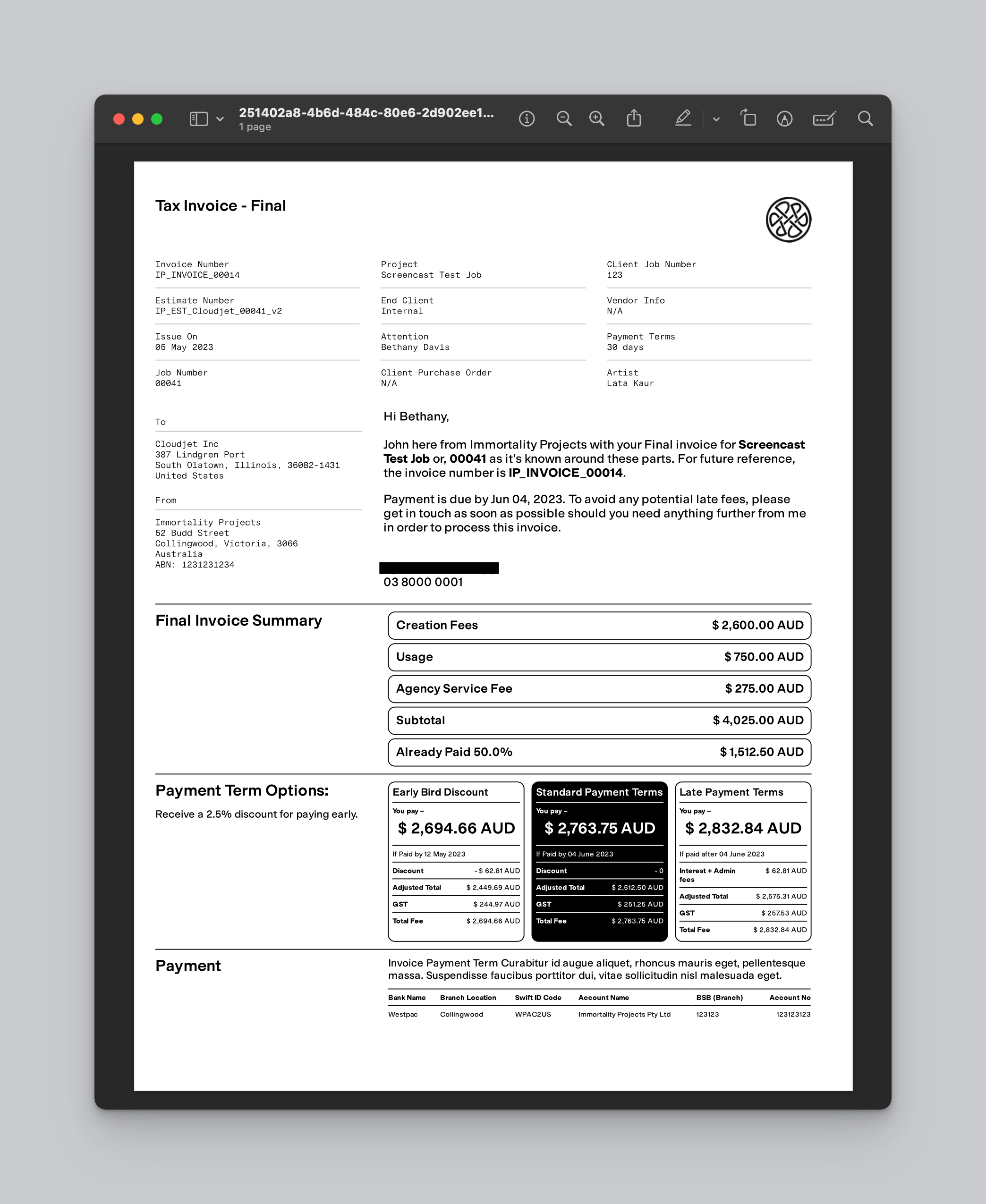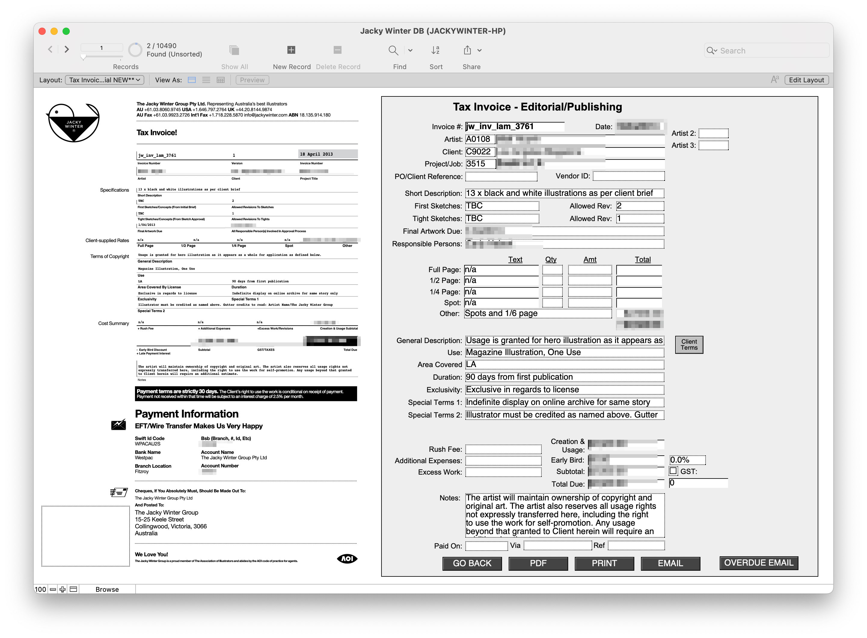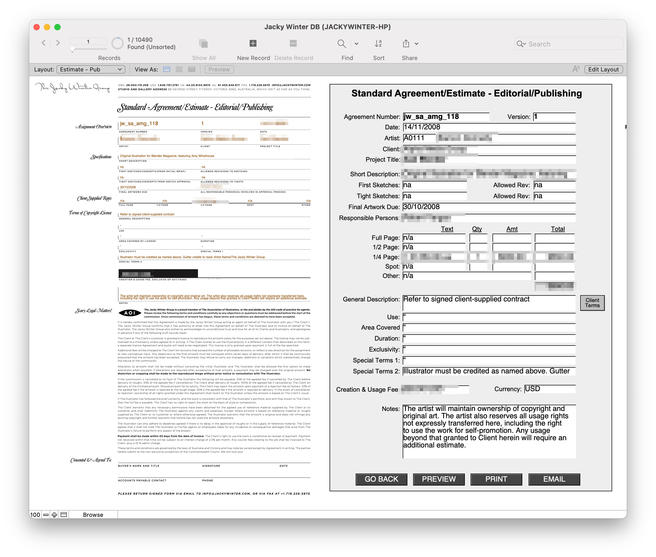 Anyway, after a meeting with Byron, I finally had my own ‘FileMaker Guy’, and in a few months he mocked up our very own app. At first it was very simple - We took the base layers of those indesign files and made them into PDFs that made the background. Then when we entered data into FileMaker, it would ‘print’ it on top of the PDF base and make a new PDF which we could email off to our clients. We could even use my precious fonts! In addition we were able to have a central record of all our jobs, could make revisions of the estimates, start building a database of clients and artists, do reports, a whole bunch of stuff.