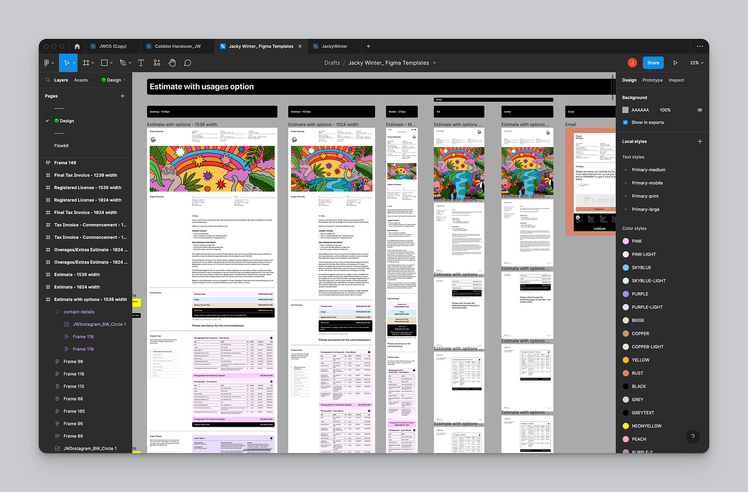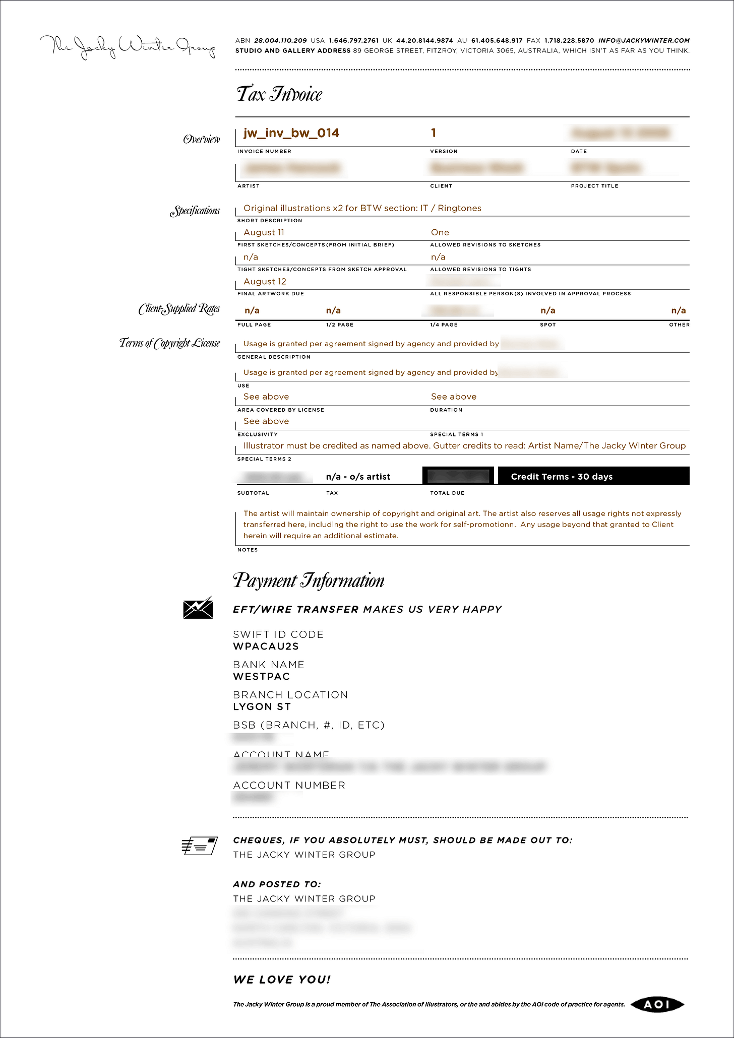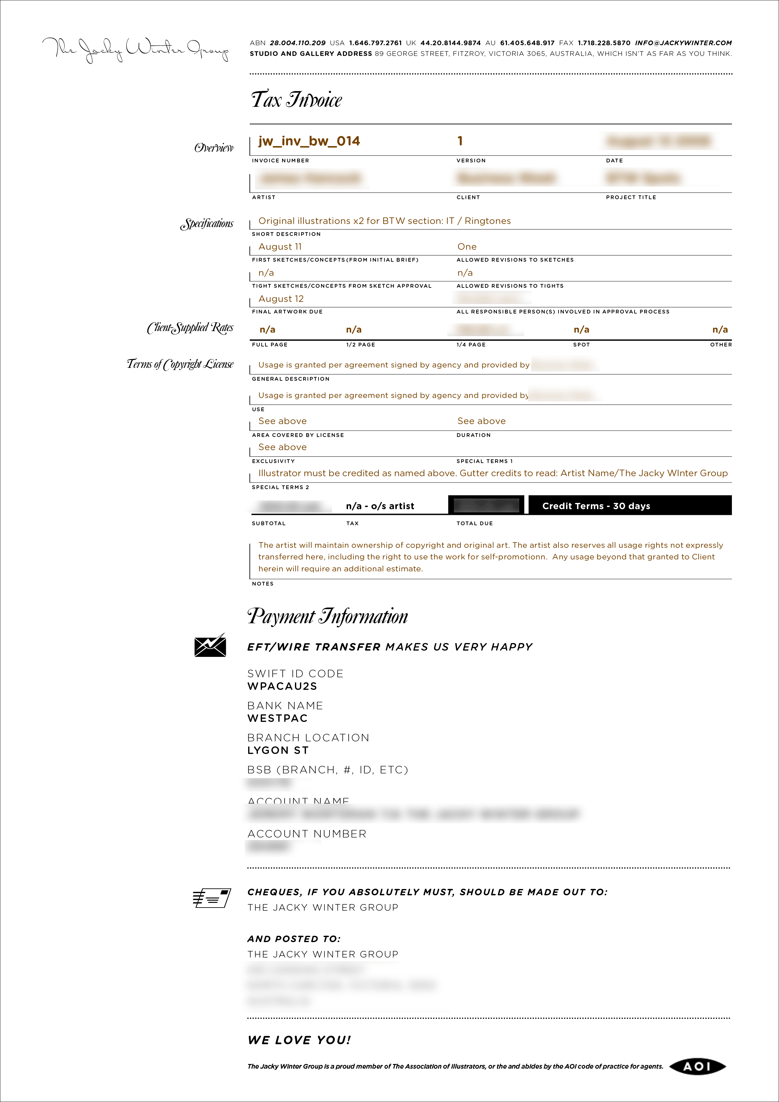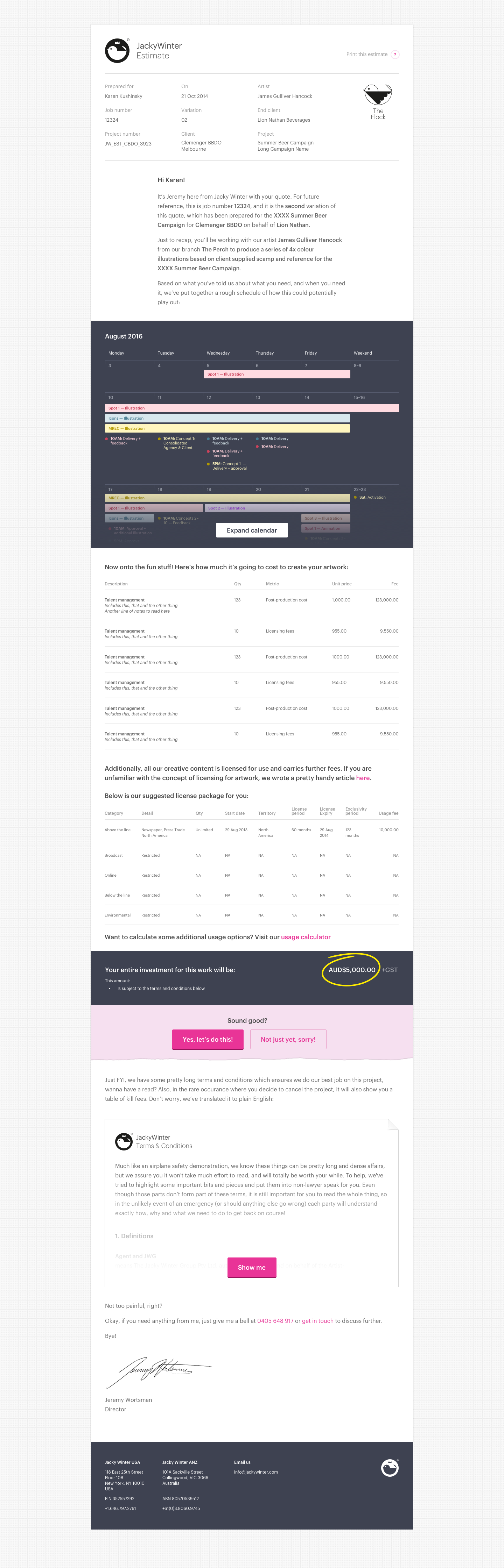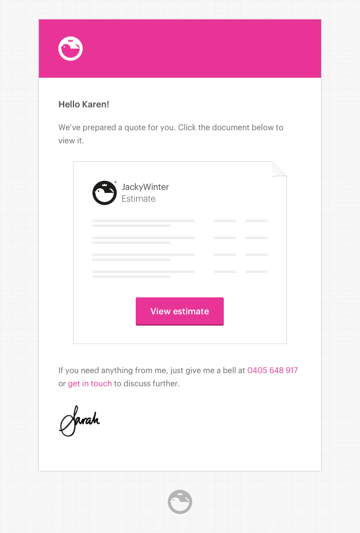 Now back around this time, online tools for quoting and invoicing were pretty much non-existent. Xero had only just started that year, and most bookkeeping and invoicing was done offline using an app called MYOB. So for the first year of Jacky Winter, everything was just done in Indesign. One file. One locked layer. Lots of duplicating and renaming files. It was a mess, but it was my mess. And it looked gorgeous, because I got to use my fonts!
