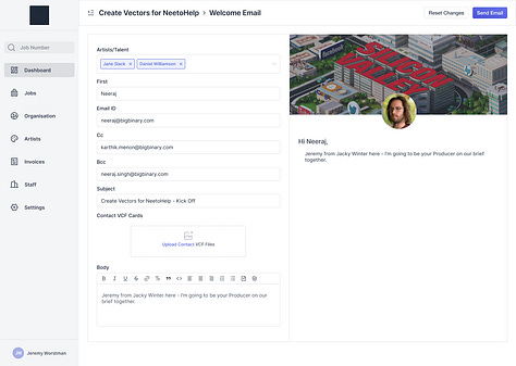 With other apps opening their API we were also able to build other bridges with other tools in our suite, such as automatically being able to set up jobs on basecamp and populating it with data from JWOS, as well as pushing invoices and RCIs directly to our new financial platform, Xero. We even were able to build our own primitive dynamic CRM to send out prompts and spreadsheets to keep on top of post-production, as well as a connection to Google to keep all our contacts updated on our phones.