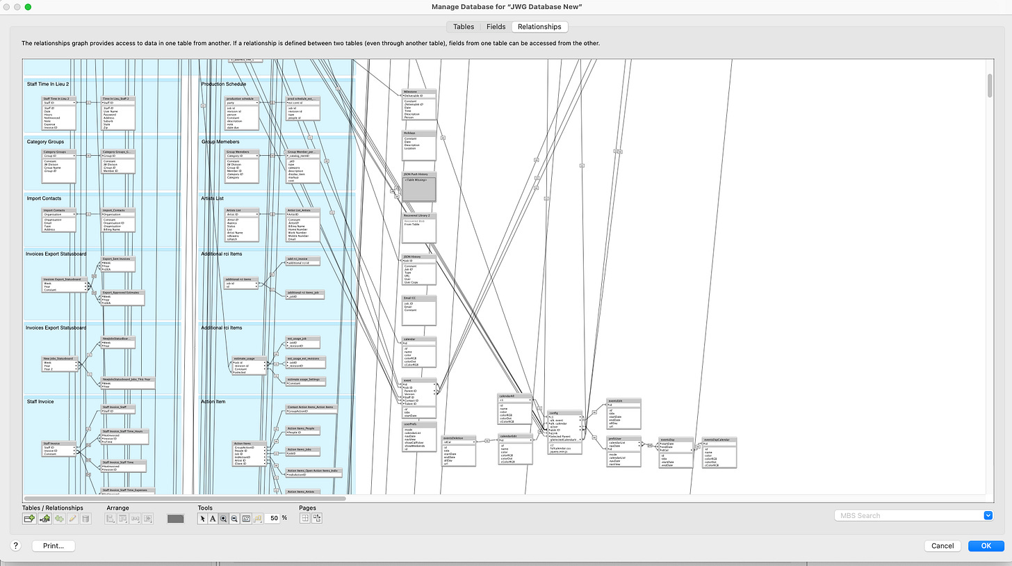 That said as things grew I was determined to do something different and find a better way to automate things. I remember from my experience working and freelancing in-house at many design studios and ad agencies that most of these companies had their own weird proprietary app (that most people hated) built on this platform called FileMaker Pro, along with the required and highly coveted ‘FileMaker Guy’ who we’d always have to call to fix something.